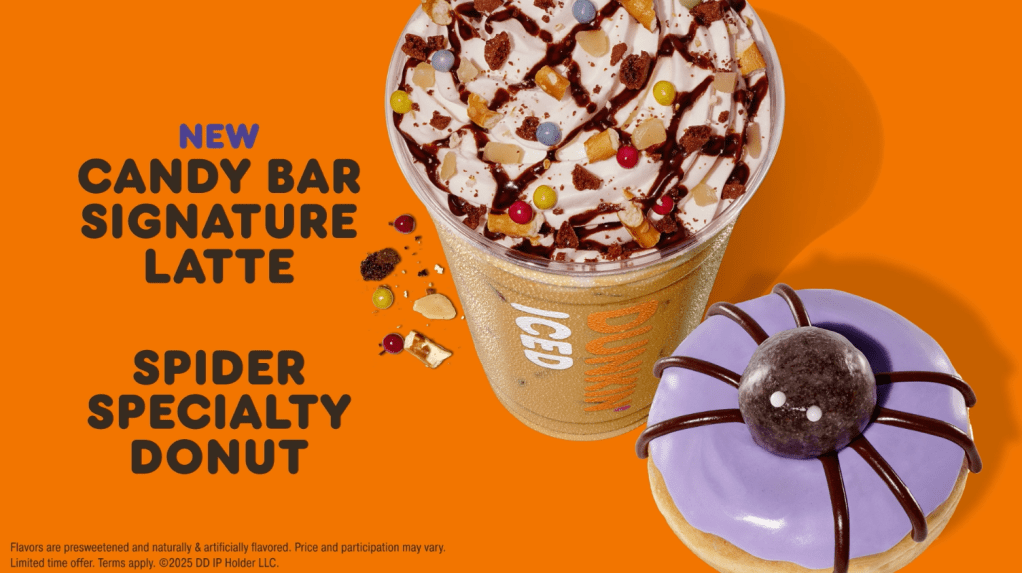 No list would be complete without talking about Dunkin’ and one of the coolest releases from the chain is its Halloween offerings. This year, the two biggest are pictured above. First is the Candy Bar Signature Latte, “a decadent blend of chocolate, toffee, pretzel and peanut butter flavors paired with rich espresso,” which was shared via Dunkin’s press release. You can also see that it’s topped with candy pieces as well.